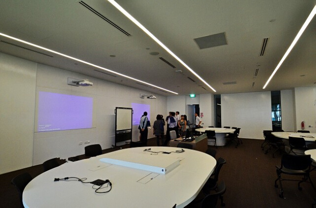 会议室的投影仪设计独特,会议室中的投影仪在演讲者身后投影,这样就不会让演讲者觉得刺眼。这些资源学生都可以通过一个网上预订系统进行预定。