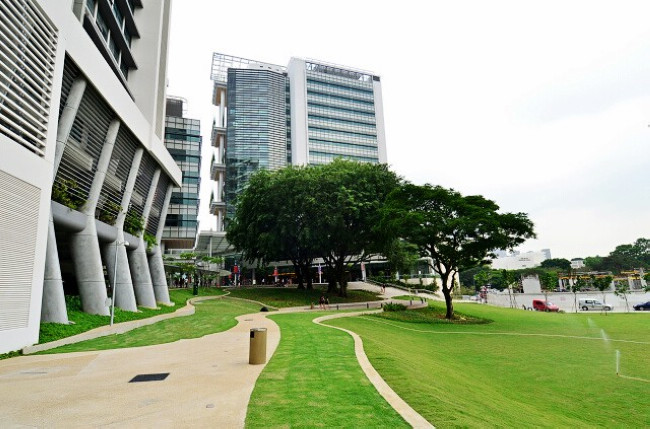 其次,宿舍的设计者保留了宿舍建成前这片土地上的大树。星巴克外面是一块绿册的草坪,宿舍楼就在草坪的旁边。如果看惯了自然风光,可能觉得新加坡的风景有些“假”,不过在这小岛上能营造出花园的效果,已经实属不易。那两颗大树在宿舍楼建成之前就已经在这块土地上生长多年,修建宿舍的时候,设计者们将它们保留了下来,使其成为宿舍整体的一部分,而不是砍掉。