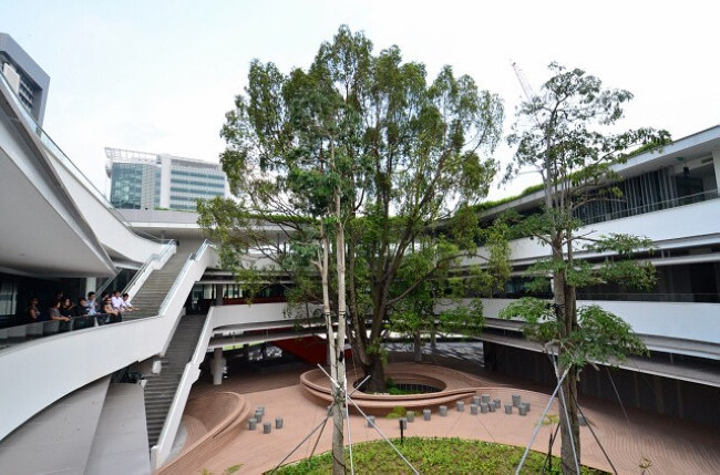 有些大树的位置正好在宿舍楼中,于是设计者将楼围绕大树而建,大树在中间看起来好像一个花园。为了不伤害大树的根,设计者在地面上铺了一层南洋的木板,这种木板不怕水,浇了雨水也没关系,换成水泥地面,大树的根往往会把水泥地弄变形。