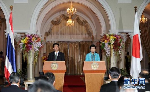 1月17日,在泰国总理府,日本首相安倍晋三(左)和泰国总理英拉出席新闻发布会。当日,日本首相安倍晋三到访泰国,这是他此次出访越南、泰国和印度尼西亚三个东盟国家的第二站。 新华社记者高健钧摄