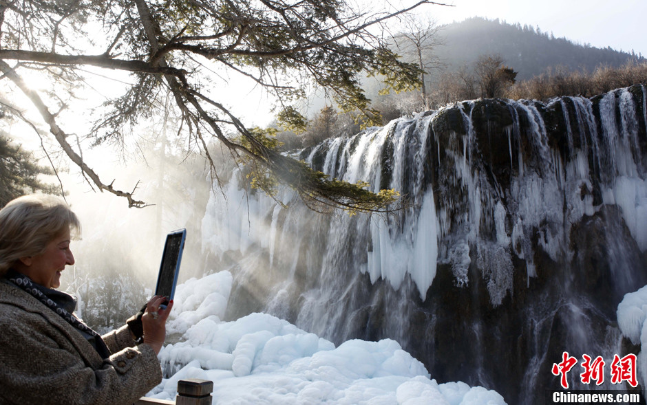 进入严冬的四川阿坝九寨沟景区一片溪水瀑布冰冻美景,呈现另一番迷人景观。中新社发 杨可佳 摄