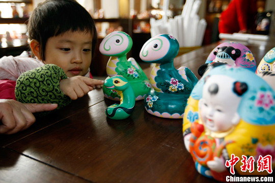 图为小朋友对蛇年生肖惠山泥塑作品《福蛇》很有兴趣。 宦玮 摄