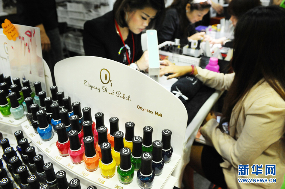 2月27日,在新加坡举行的亚洲美容美发展上,参展美甲师为参观者美甲。 当天,亚洲美容美发展在新加坡滨海湾金沙会展中心举行。新华社发(邓智炜摄)