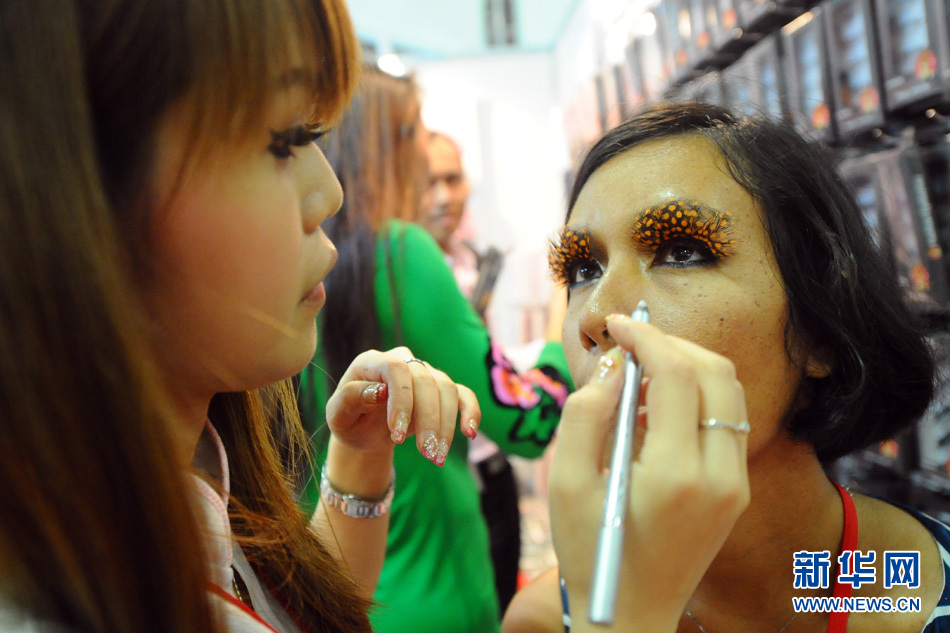 2月27日,在新加坡举行的亚洲美容美发展上,参展化妆师为参观者修饰睫毛。 当天,亚洲美容美发展在新加坡滨海湾金沙会展中心举行。新华社发(邓智炜摄)
