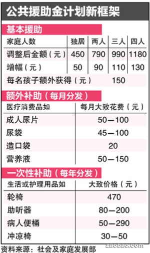除了基本现金援助外还新设两种额外补助:需要经常或长期使用成人尿片、营养液等医疗消费品者,可每月申请额外补助;有特别需求医疗和生活必需品者,可申请一次性年度补贴。这两种补贴金额不设限。
