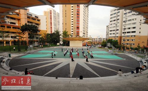 组屋制度是新加坡中产阶层得以壮大的重要保障。图为晨练中的组屋区居民。(资料图片)