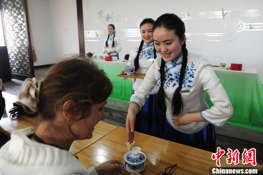 3月17日,第四届中国采茶节——国际友人采春茶活动在成都市蒲江县举行。图为三胞胎姐妹为外宾展示中国茶道。张浪 摄