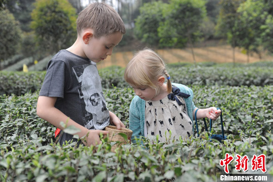3月17日,第四届中国采茶节——国际友人采春茶活动在成都市蒲江县举行。来自世界各地的外国友人聚集一堂,体验采茶,几名孩童采茶姿势像模像样,萌翻全场。张浪 摄