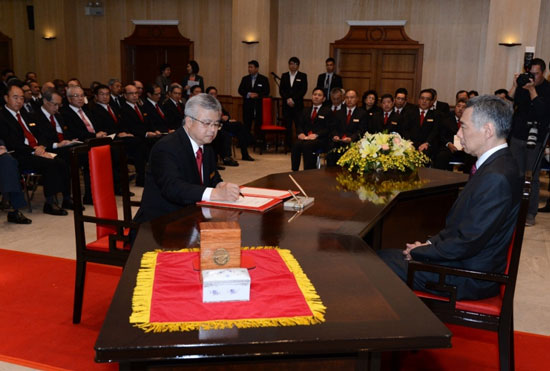 新加坡中华总商会新任会长蔡其生(左一),在新加坡总理李显龙(右一)的见证下,正式接任会长一职。图片来源:新加坡中华总商会