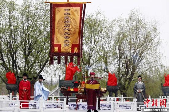 4月3日,河南开封再现了北宋清明时节皇宫中文武百官祭拜先圣先贤的恢弘场景,古典的仪式,庄重的祭文,表达了人们无尽的追思。仪式分为敬献猪牛羊三牲、净手上香、诵读祭文等环节,在场的游客也纷纷起立三拜,表达对先人的敬重和思念。中新社发 王中举 摄