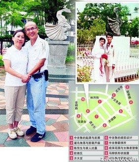 江昇桦和陈月华夫妇曾在“女舞者”塑像前拍结婚照(小图),现在担任中峇鲁历史走道导览员,解说“老地方”备感亲切。(新加坡国家文物局提供)