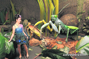 穿过一条幽深的过道,人们走入昆虫王国,进入眼帘的是随处可见的巨型蜘蛛、蚂蚁、螳螂和蜗牛等昆虫。再配合灯光和干冰效果,这片巨型昆虫“栖息地”显得格外神秘,勾起参观者的好奇心。