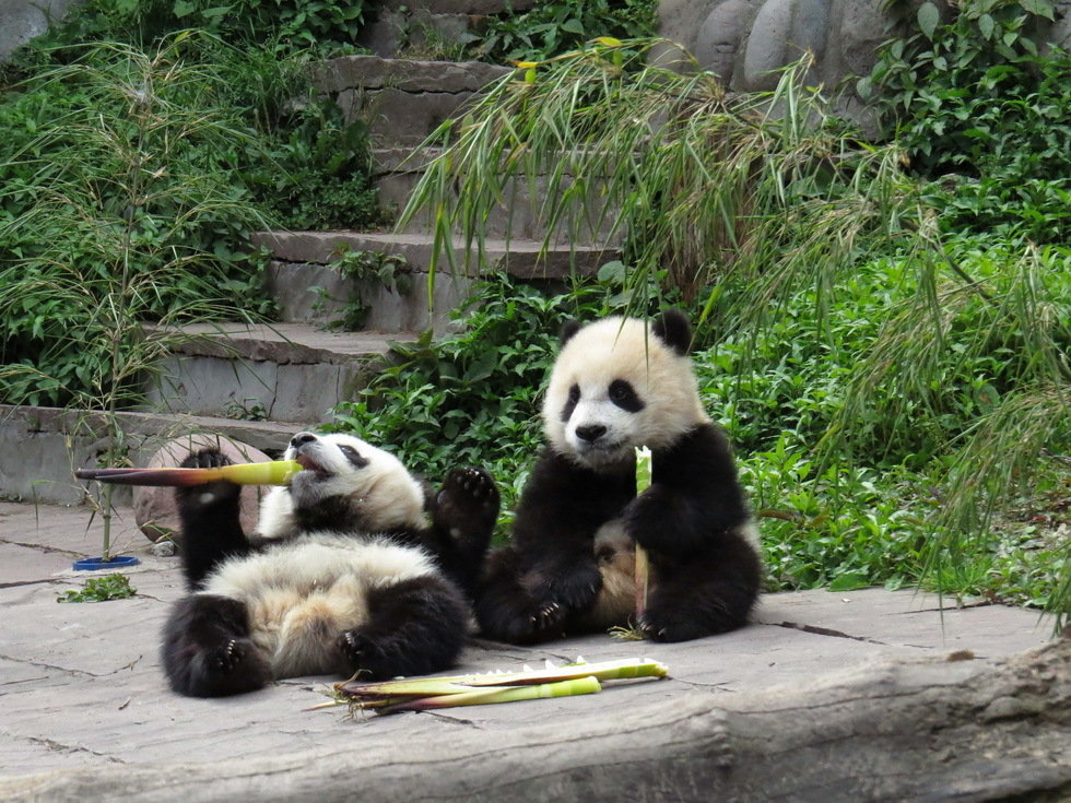 4月20日,雅安碧峰峡大熊猫基地的大熊猫在进食。4月20日发生7.0级地震的四川雅安是大熊猫之乡。据雅安碧峰峡大熊猫基地的工作人员介绍,中国保护大熊猫研究中心碧峰峡基地内的工作人员和熊猫均安全,没有出现伤亡情况。 新华网发(李伟摄)