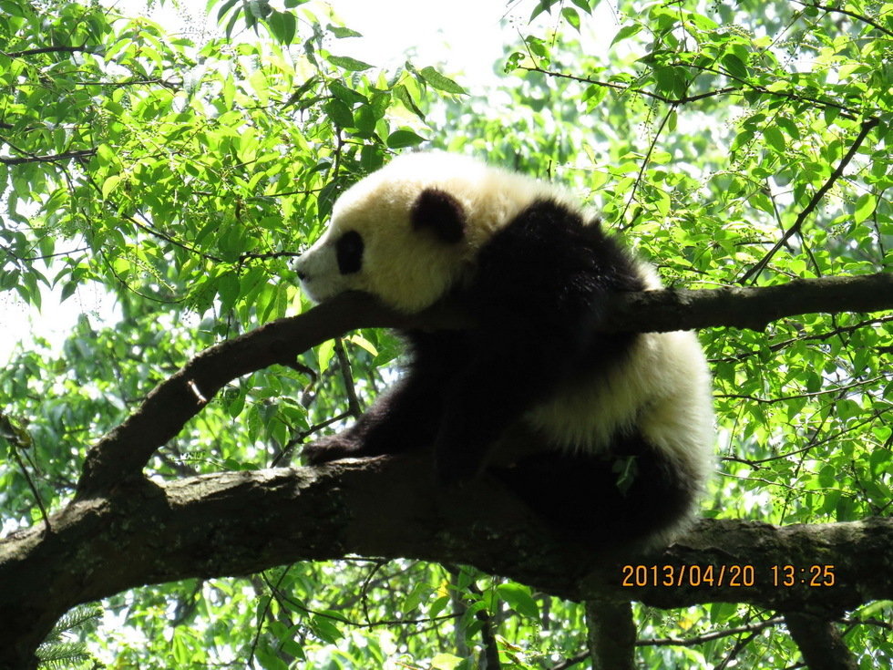 4月20日,雅安碧峰峡大熊猫基地的大熊猫在进食。4月20日发生7.0级地震的四川雅安是大熊猫之乡。据雅安碧峰峡大熊猫基地的工作人员介绍,中国保护大熊猫研究中心碧峰峡基地内的工作人员和熊猫均安全,没有出现伤亡情况。 新华网发(李伟摄)