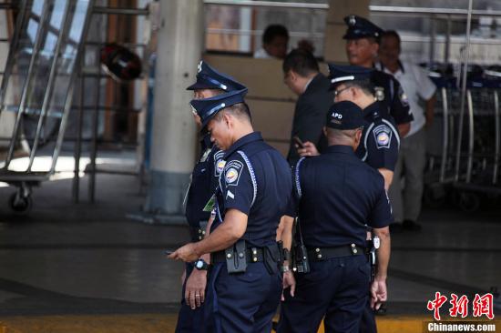 5月16日,台湾方面就菲律宾海岸警卫队枪击台湾渔船“广大兴28号”事件派出的调查人员抵达菲律宾首都马尼拉国际机场,在大批菲律宾警员护送下离开机场。张明 摄