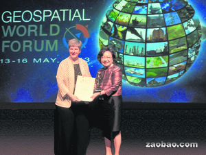 新加坡陆路交通管理局善用科技解决交通问题,首次获颁“世界地理空间卓越奖”。陆交局创新资讯与通信科技组总署长张榕玲日前代表当局,从英国国家导图机构局长劳伦斯博士手中接过奖状。(新加坡陆交局提供)