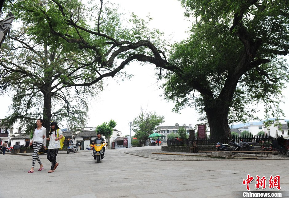 图为宏村村口古树。这两棵拥有500年树龄的大树是这牛形村的“牛角”,宏村的“风水树”,也是一种吉祥的象征。中新网记者 李美多 摄