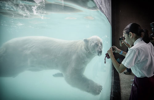 到访新加坡动物园的游客在给极地熊Inuka近距离拍照。"