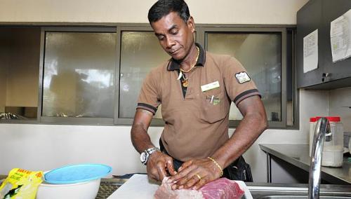 54岁的副饲养员长Tony正在准备食物。他是Inuka的喂养员之一。"