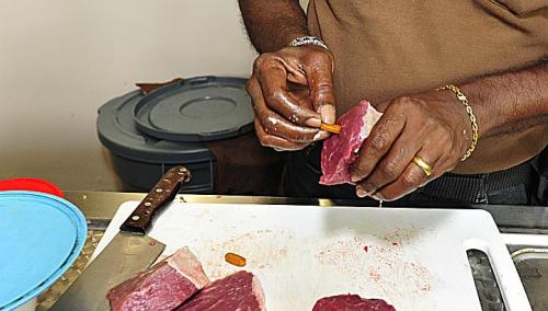 Tony正把药片塞到肉中,只有这要Inuka才会吃药。"