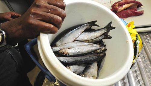 饲养员为Inuka准备了一桶鲭鱼。"