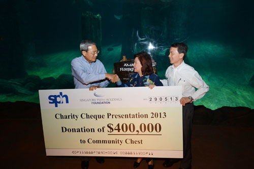 图片中新加坡报业控股公司主席立文献先生正在向社区福利基金主席蔡琼莹和全国社会服务委员会主席谢福华先生赠送支票。"