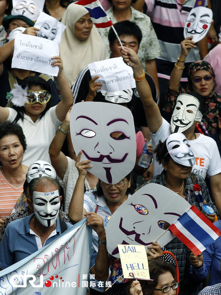 国际在线消息:当地时间2013年6月16日,泰国曼谷,泰国民众举行反政府示威游行活动,反对泰国总理英拉及前总理塔克辛。图片来源:NARONG SANGNAK/CFP