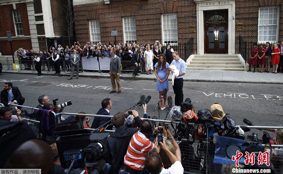 当地时间2013年7月23日,英国伦敦,威廉王子和凯特王妃抱着刚出生的小王子在圣玛丽医院外首次亮相。