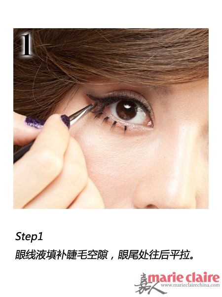 利用彩妆将眼睛横纵面同时扩张,眼线眼尾平拉增加眼长,再重上单株下睫毛拉长纵幅,不用浓厚色即可创造眼睛最大值。