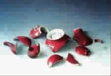 ▲明宣德红釉梨式壶修复前后
