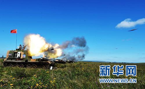 在俄罗斯切巴尔库尔合同训练场,中方炮火实施远程火力拦阻(8月12日摄)。新华社发(谭长俊 摄)