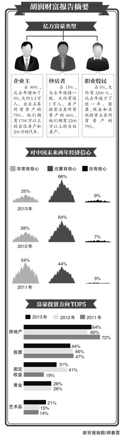 《2013胡润财富报告》称,截至2012年底,中国大陆千万富豪105万人,亿万富豪6.4万人,增速放缓