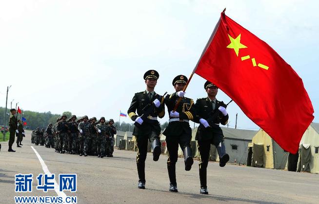 8月15日,在俄罗斯切巴尔库尔合同训练场,中方参演官兵在演习结束仪式上举行阅兵式。北京时间8月15日17时许,中俄双方在俄罗斯切巴尔库尔合同训练场举行结束仪式。中方总导演、沈阳军区副司令员石香元宣布,“和平使命—2013”中俄联合反恐军事演习圆满结束。新华社发(谭长俊摄)