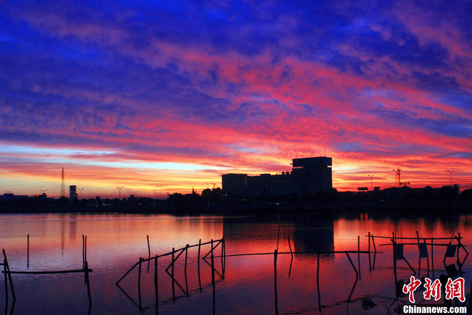 8月16日早晨,一片美丽的火烧云出现在浙江绍兴市区上空。中新社发 李瑞昌 摄 图片来源:CNSPHOTO