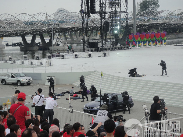 正在大家沉浸在欢乐的氛围时,手持枪械的“恐怖分子” 突然闯入舞台现场,“扫射”并挟持“人质”, 刚看到这一幕,记者的情绪一下子从轻松变得紧张起来。很快,警察部队的反蜂拥恐怖袭击部队第一时间赶到,以迅雷不及掩耳之势制服歹徒,恢复秩序。有不少观众很欣赏这个表演,一名观众说:“恐怖袭击是很真实的,看了他们的展示,我对我国军警对抗恐怖分子的能力很有信心。”接下来,一组组手持枪械的军人全副武装,模拟深入敌营的高度警戒状态,走入观众席,让人感受到紧张气氛,成了全场焦点。由于太过逼真,据说有的小孩子还被吓哭,不过,大多数人都为与军人近距离接触感到兴奋,不停拿起相机拍照。