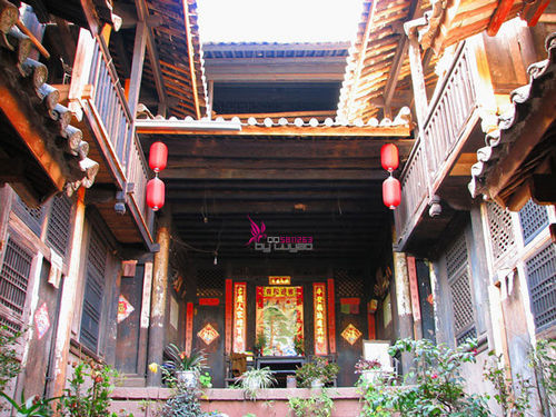 从下往上向上望去,民居层层叠叠,错落有致。由下向上建有:龙王庙、古江西会馆、万寿宫,还有古榕树、黄姓家族的“题名访”和玉皇阁前的“棂星门”,它是滇西现存最大的古木牌访。再上去就是玉皇阁建筑群,周围全是高大的古黄连木,树高多达三四十米,最古老的树龄已有800多年。