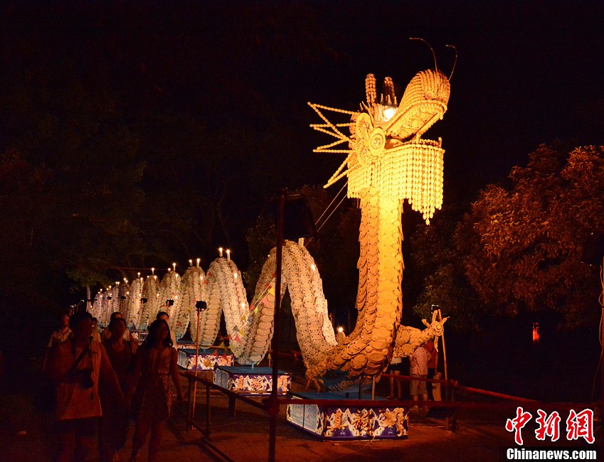 9月18日,传统中秋佳节来临之际,在广西桂林七星公园内举办的中秋彩灯博览会上,由景德镇瓷器组装,命名为“真龙”的70多米长大型瓷龙灯组,吸引观众眼球。据了解,本次彩灯博览会的灯组设计融合了中秋文化、桂林山水文化、民族风情等多种元素,除巨型中国航母灯组、大型瓷龙灯组外还有天安门、鱼跃龙门等大型灯组。为广大市民和中外游客带来了一场彩灯艺术的视觉盛宴。中新社发 唐梦宪 摄