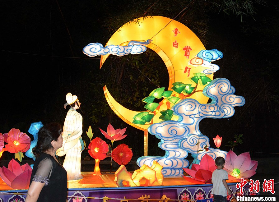 9月18日,传统中秋佳节来临之际,广西桂林七星公园内举办的中秋彩灯博览会,为广大市民和中外游客带来了一场彩灯艺术的视觉盛宴。据了解,本次彩灯博览会的灯组设计融合了中秋文化、桂林山水文化、民族风情等多种元素,除巨型中国航母灯组、大型瓷龙灯组外还有天安门、鱼跃龙门等大型灯组。中新社发 唐梦宪 摄