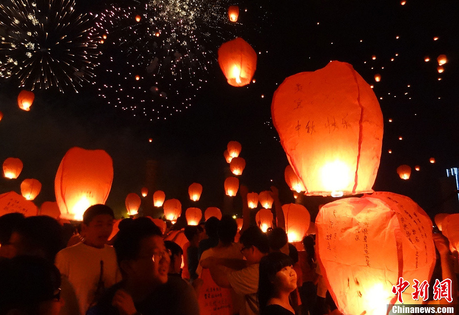 2013年9月18日晚,江西宜春举行“中秋拜月·火龙追月”中秋民俗活动。图为,民众燃放数以千计的孔明灯祈福。邹海斌 摄