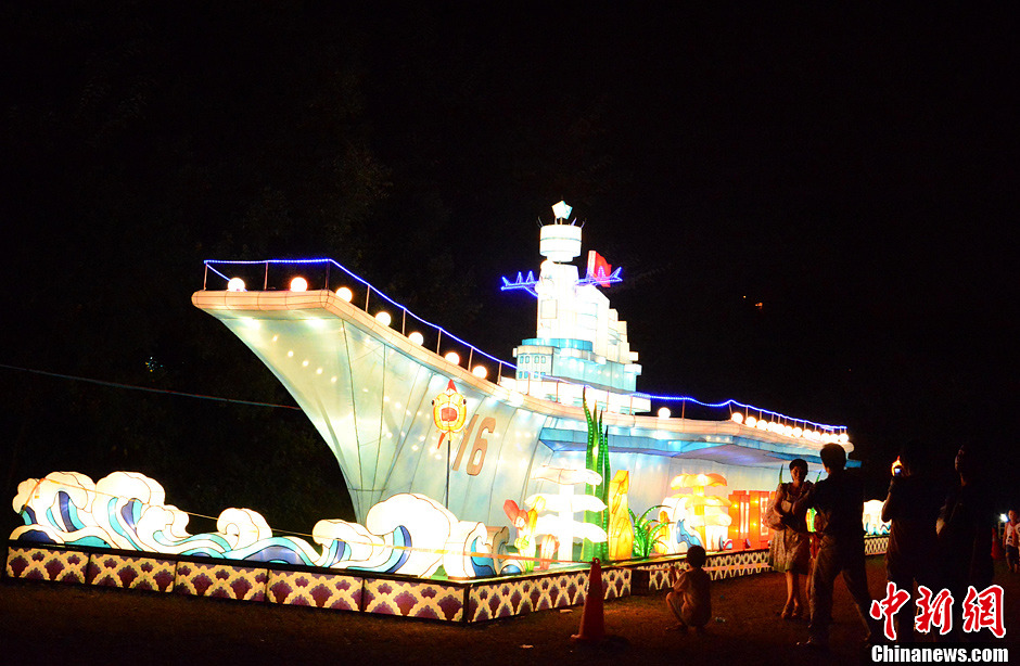 9月18日,传统中秋佳节来临之际,在广西桂林七星公园内举办的中秋彩灯博览会上,巨型中国航母灯组亮相。据了解,本次彩灯博览会的灯组设计融合了中秋文化、桂林山水文化、民族风情等多种元素,除巨型中国航母灯组、大型瓷龙灯组外还有天安门、鱼跃龙门等大型灯组。为广大市民和中外游客带来了一场彩灯艺术的视觉盛宴。中新社发 唐梦宪 摄