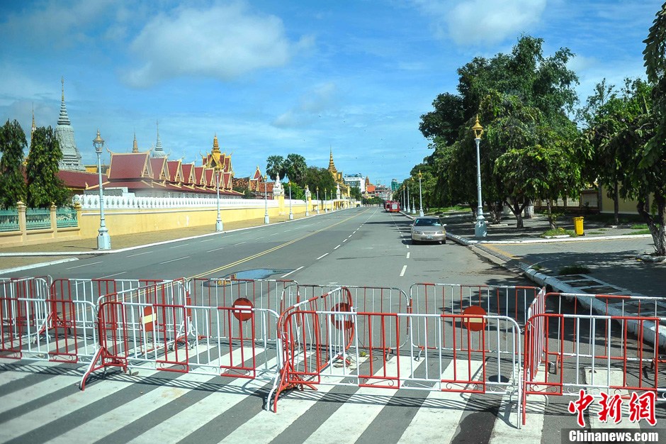 9月22日,柬埔寨金边,警察对皇宫周边的道路进行戒严。由于柬埔寨反对党救国党对国会选举结果不满,要求国王西哈莫尼延期召开新一届国会首次会议。此前反对党及其支持者还进行了为期三天的大规模示威活动。中新社发 洪坚鹏 摄