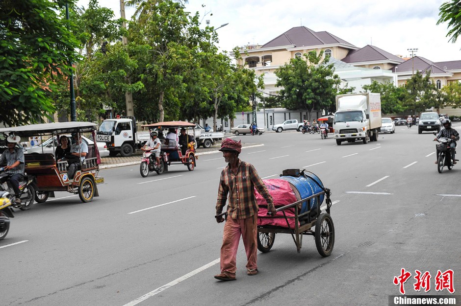 9月22日,柬埔寨金边,当地居民穿过街道。由于柬埔寨反对党——救国党对国会选举结果不满,要求国王西哈莫尼延期召开新一届国会首次会议。此前反对党及其支持者还进行了为期三天的大规模示威活动。中新社发 洪坚鹏 摄