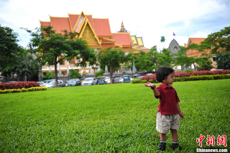 9月22日,柬埔寨金边,当地一名儿童在草坪上拍照。由于柬埔寨反对党——救国党对国会选举结果不满,要求国王西哈莫尼延期召开新一届国会首次会议。此前反对党及其支持者还进行了为期三天的大规模示威活动。中新社发 洪坚鹏 摄
