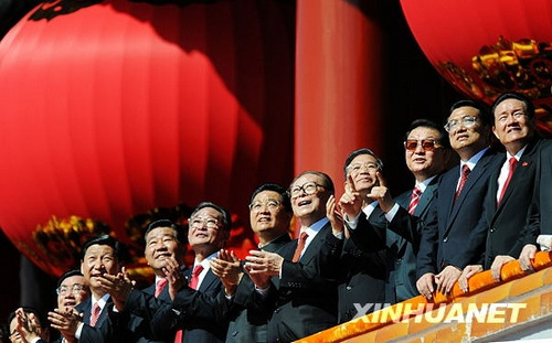 2009年国庆节,胡锦涛、江泽民、吴邦国、温家宝、贾庆林、李长春、习近平、李克强、贺国强、周永康在天安门城楼上。
