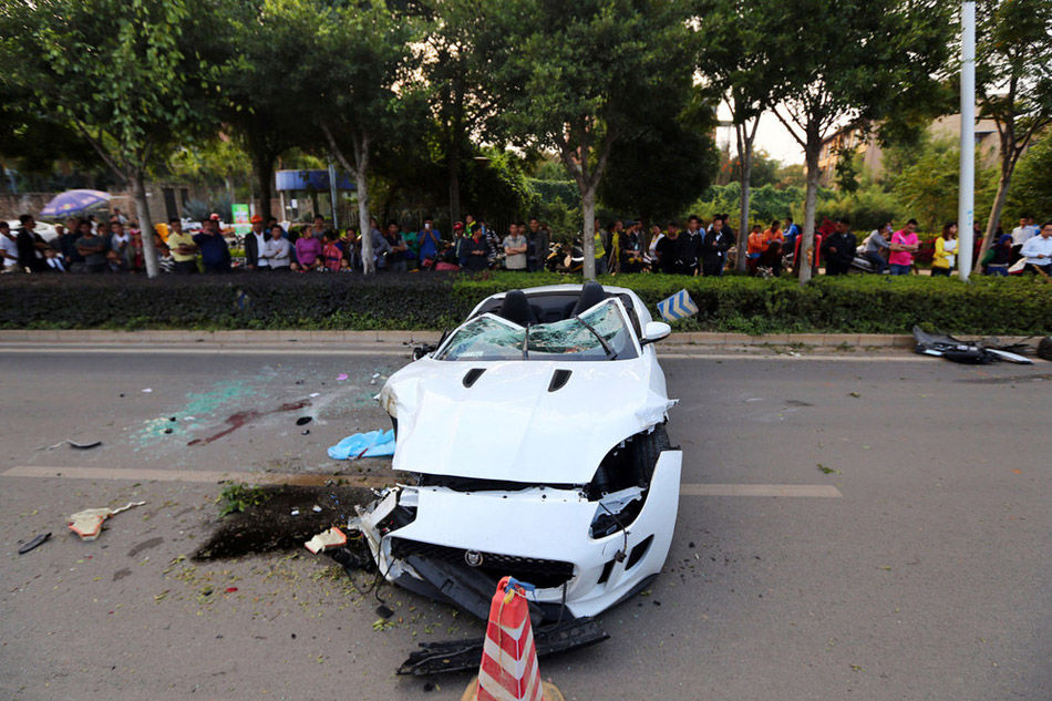 据凤凰网报道,14日下午,昆明市区发生一起重大交通事故。一捷豹跑车在市区道路飙车,因避让前车不及撞上路边绿化带,豪车司机从驾驶室弹飞后,当场死亡。