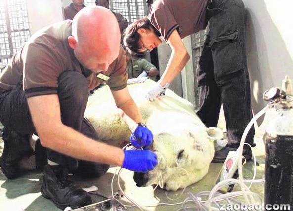 动物园兽医在10月9日为伊努卡(Inuka)进行每年一次的身体检查。今年22岁,身长2.5米,体重532公斤的伊努卡,在长达一小时的检查中全身麻醉,让兽医检查它的牙齿、耳部和掌部。