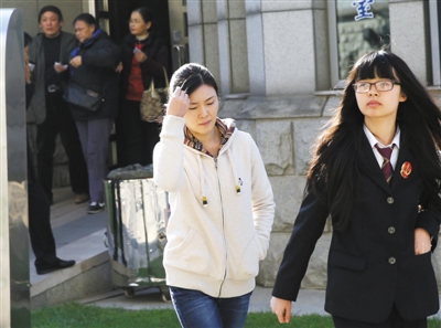 昨日下午,原铁道部运输局局长张曙光的情妇罗菲(白衣者),在书记员的带领下,准备进入法庭受审。检方指控她涉嫌掩饰、隐瞒张曙光受贿犯罪所得198万余元。庭审中,罗菲认罪,目前其处于取保候审中。 新京报记者王贵彬摄