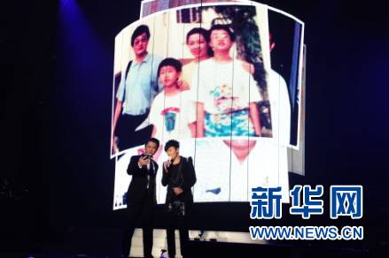 图为林俊杰与哥哥林俊峰合唱了《飞机》,并在台上玩自拍