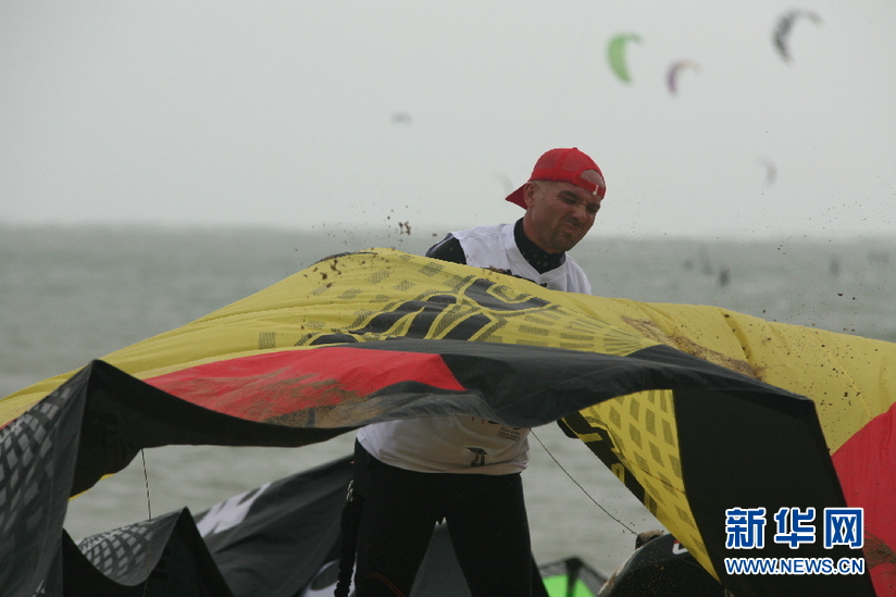 11月20日,开赛第一天,运动员在奋力整理风筝。新华网记者 蔡啸天 摄