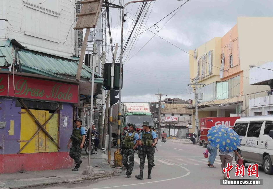 11月29日,菲律宾台风重灾区塔克洛班市闹市区,一批全副武装的特警队员在巡逻。11月8日,超强台风“海燕”袭击菲律宾中部地区,塔克洛班市受灾尤其严重,当地饥饿的灾民一度曾哄抢店铺,引发大批商人出逃,政府增派军警维持治安,并实施宵禁措施。中新社发 张明 摄